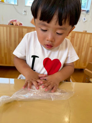 カットしたバナナをジップロックに入れて渡すと、ゆっくり丁寧にバナナをつぶす子、ペースト状になるまで力いっぱいつぶす子など、一人ひとり違う様子を見ることができました。また、形→ペースト状になる変化も体験することができました。