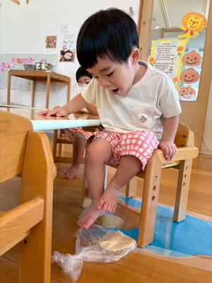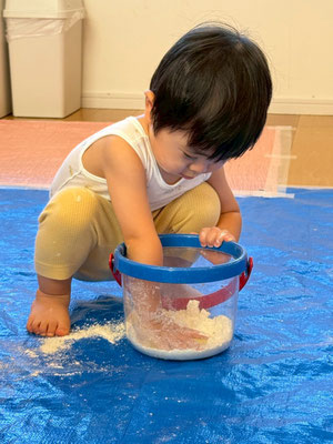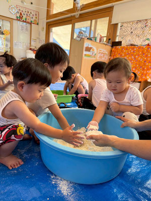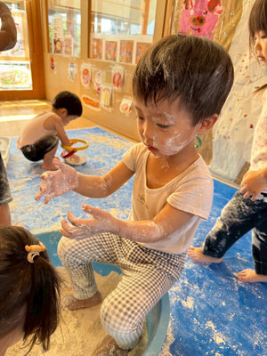 その後、小麦粉に触ってみました。最初はサラサラ、ふわふわの感触を楽しみました。気持ちがよくて長い時間触ったりしている姿がありました☺