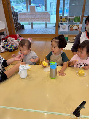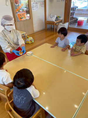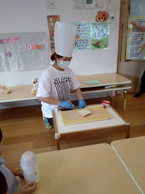 三角に切ってもらった食パンに、バターナイフを使って自分でジャムを塗りました!上手にできるかなぁ💦と不安でしたが、子ども達は上手に塗ることができました。自分で塗ったサンドイッチはとても美味しく、完食する子がほとんどでした☺