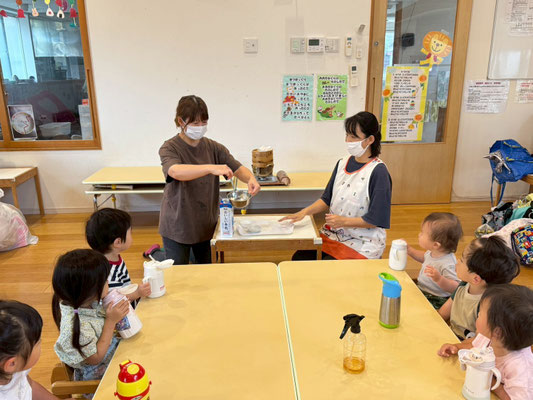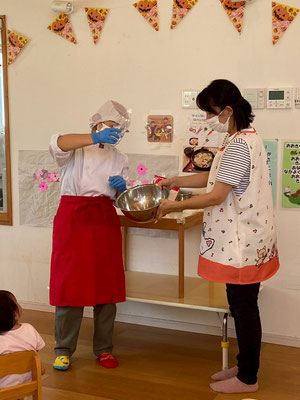 牛乳を入れて混ぜる場面では、勢いあまって牛乳が飛び出す場面もありましたが、みんな上手に混ぜることができていました☺