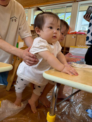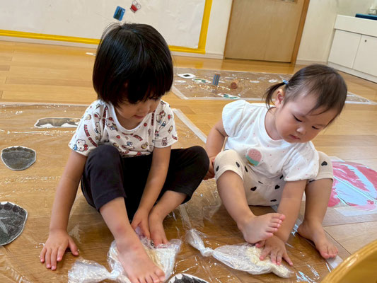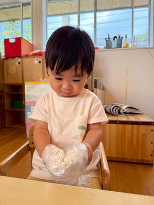次に小麦粉に色水を入れて変化を楽しみました。ドロドロ・ベタベタになると手の感触が嫌なお友だちや、ずーっと捏ねたりして遊ぶお友だちなど、一人ひとり違う様子を見ることができました☺