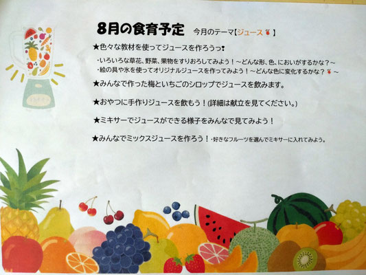 いろいろな食材を使ってジュースを作ってみたり、絵の具や氷を使って自分だけのオリジナルジュース作り(ごっこ遊び)をする予定です☺