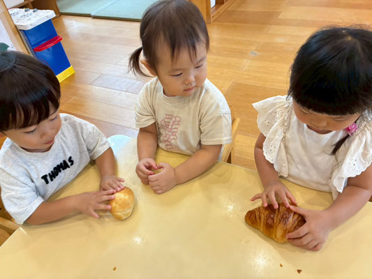 子ども達が触ったパンとは別のパンを用意して、パンを半分に切り、中身がどうなっているかを見たり、いろんな種類のパンを食べ比べました。