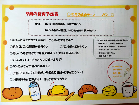 子ども達と一緒にパン作りをしたり、パンの材料や種類などを見たり触ったりする予定です。