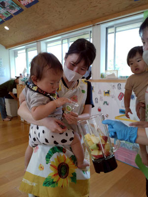 選んだフルーツはミキサーの中に入れてもらいました。あわせて水と氷を追加し、ミキサーのスイッチをオン!音にびっくりする子もいましたが、形があるもの⇒液状に変化していく様子を観察しました。