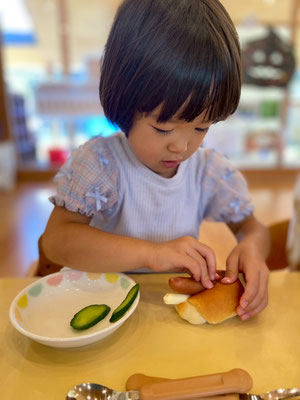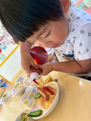 自分でパンに具材を挟み込み、最後にトマトケチャップをかけました☺自分で作ったサンドイッチは美味しく、顔にケチャップをつけながら頬張っていました☺