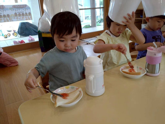 おやつの時間にジャムサンドイッチを作り、みんなで食べました。