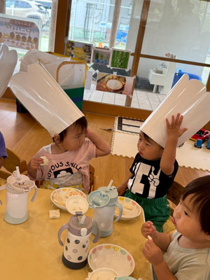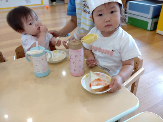 「バナナはいらない!」とクリームたっぷり入れたサンドウィッチを作る子、バナナをたくさん入れる子など、一人ひとり自分だけのサンドウィッチを作りました。顔いっぱいにクリームをつけながら「おいしい~♪」とニコニコ笑顔で食べいました☺