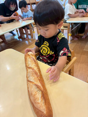 今回の食育は、「いろいろなパンがあることを子ども達に知ってもらおう!」をテーマにしました。市内にあるパン工房feelさんからパンを購入し、実際にパンを触ったり匂いを嗅いだりしました。